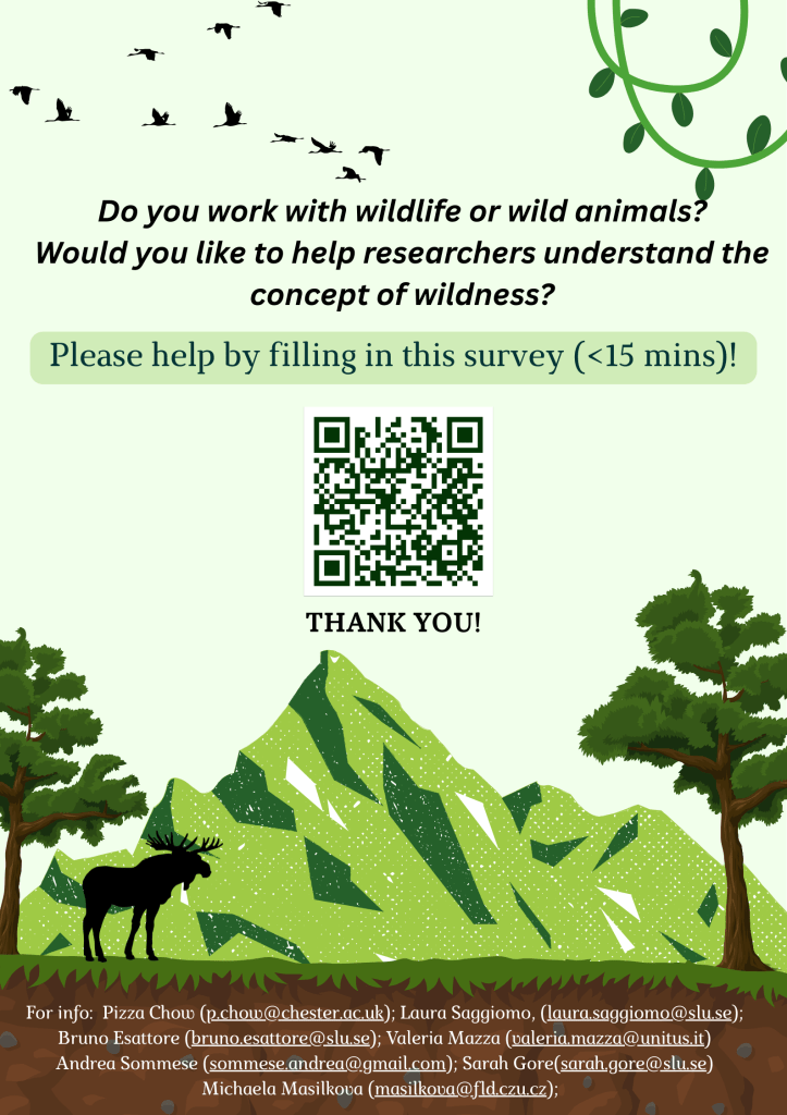 We are completing a research project about ‘A Quantitative Approach To Understanding Wildness’. It is an online survey that seeks your professional thoughts about the concept of wildness, nature-relatedness, as well as attitude toward and acceptability of wildlife. We would be grateful if you would spend no more than 15 minutes completing the online survey (scan QR code below or here). It is entirely voluntary, and you can withdraw from the study anytime.